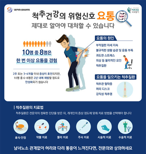 김은상 대한척추신경외과학회장은 “요통이 장기간 이어지면 디스크, 척추관 협착증 등과 같은 일상생활에 영향을 미치는 척추질환을 의심해 봐야 하지만 대수롭지 않게 생각하고 방치하는 경우가 많다”며, “요통은 척추건강의 위험 신호인 만큼, 요통을 겪고 있는 많은 국민들이 조기에 정확한 진단을 받아 평생 건강한 척추를 유지할 수 있도록 대한척추신경외과학회는 올해에도 올바른 척추질환 정보를 알리는 활동을 이어갈 예정”이라고 전했다.