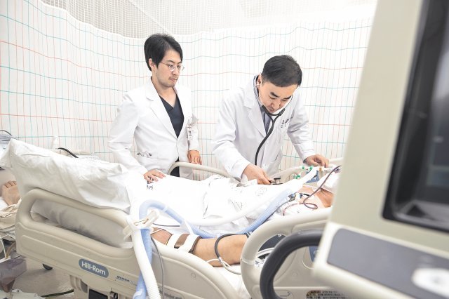 고대구로병원의 김남렬 중환자실장(오른쪽·대한외상중환자외과학회장)이 중환자를 진료하고 있다. 고대 구로병원 제공