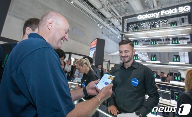 7일(현지시간) 독일 베를린에서 열린 유럽 최대 가전 전시회 ‘IFA 2019’에서 삼성전자 전시장을 방문한 관람객들이 ‘갤럭시 폴드 5G’를 체험하고 있다. (삼성전자 제공) 2019.9.7/뉴스1