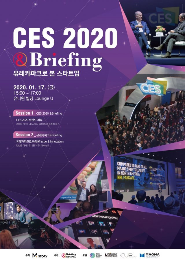 엠스토리가 주최하고 앤브리핑채널(&Briefing Channel)이 주관하는 CES 2020 리뷰 세미나 ‘CES 2020&Brieifng(2020 CES 앤브리핑)이 17일 서울 서초구 유니원 빌딩 Lounge U에서 열린다. IT에 관심 있는 관계자, 스타트업 관계자 및 일반인들을 대상으로 무료로 개최된다.