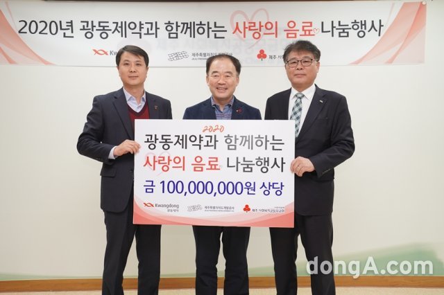 광동제약은 13일 제주사회복지공동모금회에 1억 원 상당 성금 및 의약품을 전달했다고 밝혔다. 이번 후원은 제주삼다수 소매용 제품의 도외지역 위탁판매를 맡고 있는 광동제약이 제주도의 소외계층을 위한 사회공헌활동의 일환으로 진행됐다. 이 활동은 지난 2013년부터 이어지고 있다.