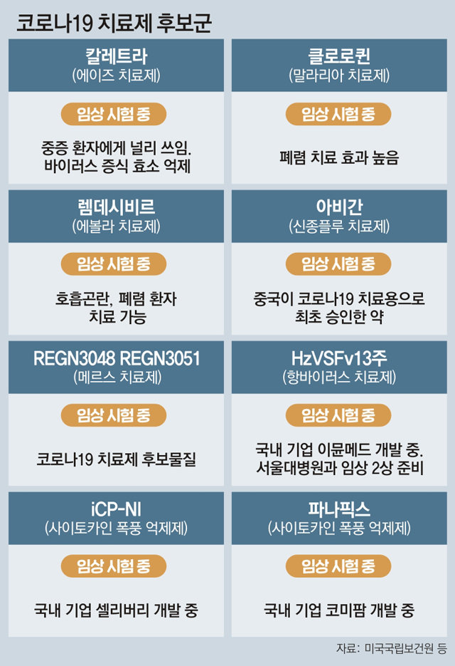 국내 기업과 연구기관도 마찬가지 전략을 시도중이다. 일부 제약사들은 자체 개발한 신약후보물질 가운데 코로나19 치료에 효과가 있을 것으로 보이는 것을 추려 임상시험을 계획하고 있다. 코미팜은 자사 신약후보물질인 파나픽스를 활용해 긴급 임상시험(2~3상)을 진행하겠다고 지난달 27일 밝혔다. 파나픽스는 코로나19 환자의 상태를 급격히 나빠지게 하는 면역 과다 발현 반응인 ‘사이토카인 폭풍’을 억제해 생명을 구하는 원리의 신약 후보물질이다. 셀리버리 역시 사이토카인 폭풍을 억제하는 신약후보물질을 임상시험하기 위해 상급종합병원 2곳과 계약했다. 이뮨메드는 서울대병원과 함께 자체 개발한 항바이러스 치료물질을 코로나19 치료용으로 임상시험에 착수했다. 현재 1상을 끝내고 2상을 준비하고 있다. 셀트리온과 한미약품도 코로나19를 억제하기 위한 치료물질을 개발하고 있다. 한국파스퇴르연구소와 한국화학연구원은 지난달 28일, 각각 약물 5000종과 1500종의 약효를 분석하는 방식으로 코로나19 치료제 후보물질을 찾아내 이달 말~4월 초까지 일선의 의사들에게 제공하겠다고 밝혔다.