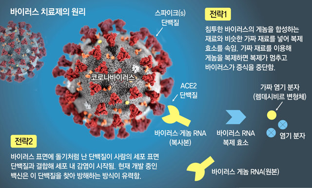 인류가 감염병 치료에 대응할 무기는 크게 세 가지다. 먼저 질병 감염 여부를 확실히 판단하는 진단기술이 있다. 진단시약과 키트는 국내외에서 여럿 개발돼 승인 받았고, 현재도 사용되고 있다. 한국이 기술적으로 우위를 보이는 분야기도 하다. 두 번째와 세 번째가 감염자를 치료하는 치료제와, 예방을 목적으로 하는 백신이다. 치료제와 백신은 바이러스 특성을 공격해 인체 내 바이러스 증식을 막는 데 주력한다. 크게 두 가지 대표적인 전략이 연구되고 있다.