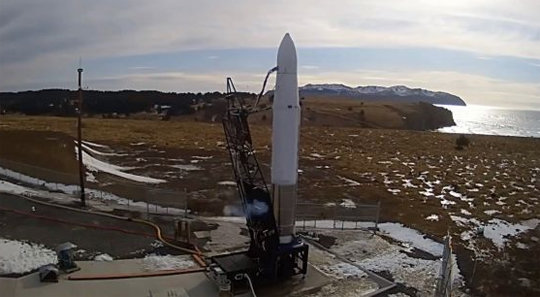 이달 3일(현지 시간) 미국 알래스카 코디액 공군기지에서 발사를 기다리고 있는 미국 민간우주개발업체 ‘애스트라’의 우주발사체 ‘로켓 3.0’. DARPA 제공