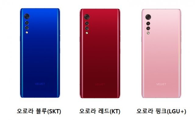 지난 5일, LG전자는 자사의 신형 스마트폰인 \'벨벳(LM-G900N)\'의 이동통신사 전용 색상 모델을 SK텔레콤(이하 SKT)와 KT, 그리고 LG유플러스(이하 LGU+) 3사를 통해 출시한다고 전했다. LG 벨벳은 기존에 팔리던 오로라 화이트, 오로라 그레이, 일루젼 선셋, 오로라 그린의 4가지 모델에 \'오로라 블루(SKT 전용)\', \'오로라 레드(KT 전용)\', \'오로라 핑크(LGU+ 전용)\' 모델이 추가되어 총 7가지 색상 중 하나를 선택할 수 있게 되었다. 그리고 이들 이동통신사 전용 색상 모델 후면에는 기존 모델 후면에 있던 LG 로고 대신 \'벨벳(VELVET)\' 로고가 찍힌 것이 특징이다.