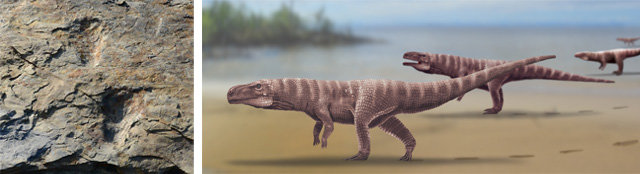 발자국) 화석. 오른쪽 사진은 앞발과 꼬리를 들고 두 발로 걸었을 것으로 추정되는 중생대 백악기 전기 원시악어 상상도. 김경수