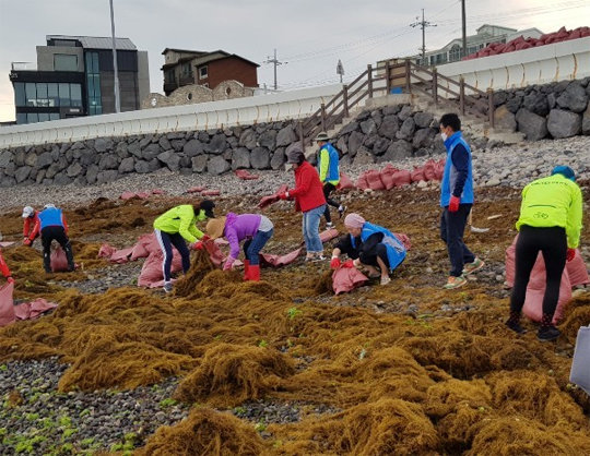 자원봉사자들이 제주 제주시 내도동 알작지에 유입된 괭생이모자반 수거 작업을 하고 있다. 제주도 제공