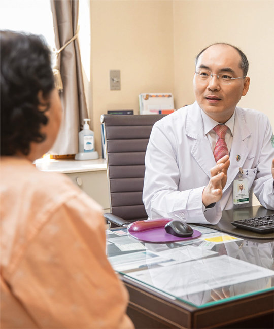 임우성 이대여성암병원 유방암센터장이 환자에게 유방암 최소침습수술인 유륜 절개 수술법에 대해 설명하고 있다. 이대목동병원 제공