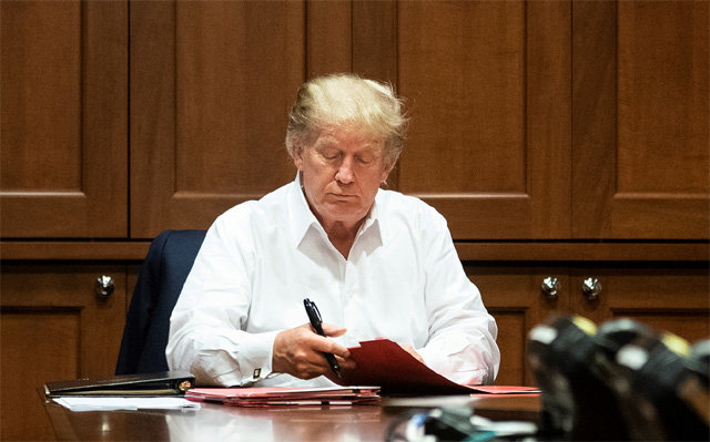 도널드 트럼프 미국 대통령이 최근 신종 코로나바이러스 감염증(코로나19) 확진 판정을 받은 뒤 군병원에서 입원 최근 도널드 트럼프 미국 대통령이 신종 코로 치료를받을때업무를보는모습. 베세즈다=AP뉴시스