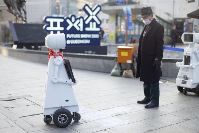 행사 방문객이 자율주행 방역로봇 디스플레이의 정보를 확인하고 있다. 출처=IT동아