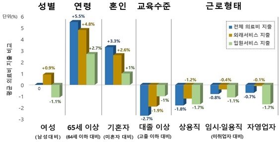 혼인여부에 따라서는 미혼자보다 기혼자의 의료비 지출이 3.3% (외래 2.6%, 입원 1%) 더 높았으며, 고졸 이하 그룹보다 대학교 학사 이상 그룹에서 전체 의료비 지출이 2.7% (외래 1.9%, 입원 1%) 더 낮게 나타났다. 또 미취업자의 의료비 지출이 근로자보다 더 높게 나타났으며, 근로형태별로는 미취업자의 의료비 지출이 상근직, 임시·일용직, 자영업자보다 각각 1.8%, 0.8%, 0.7% 더 높게 나타났다.