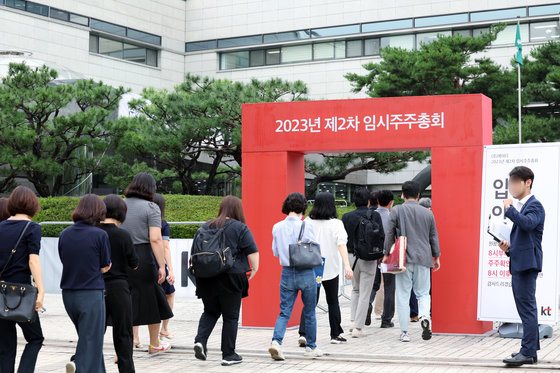 30일 오전 서울 서초구 우면동 KT연구개발센터에서 열린 KT 2023년 제2차 임시주주총회장으로 주주들이 입장하고 있다. 이날 임시주주총회의 주요 안건은 김영섭 대표이사 후보자 선임의 건으로 김 후보자가 대표로 공식 선임되면, 반년간 이어진 KT 사상 초유의 장기 경영 공백이 마침표를 찍게 된다. 2023.8.30. 뉴스1
