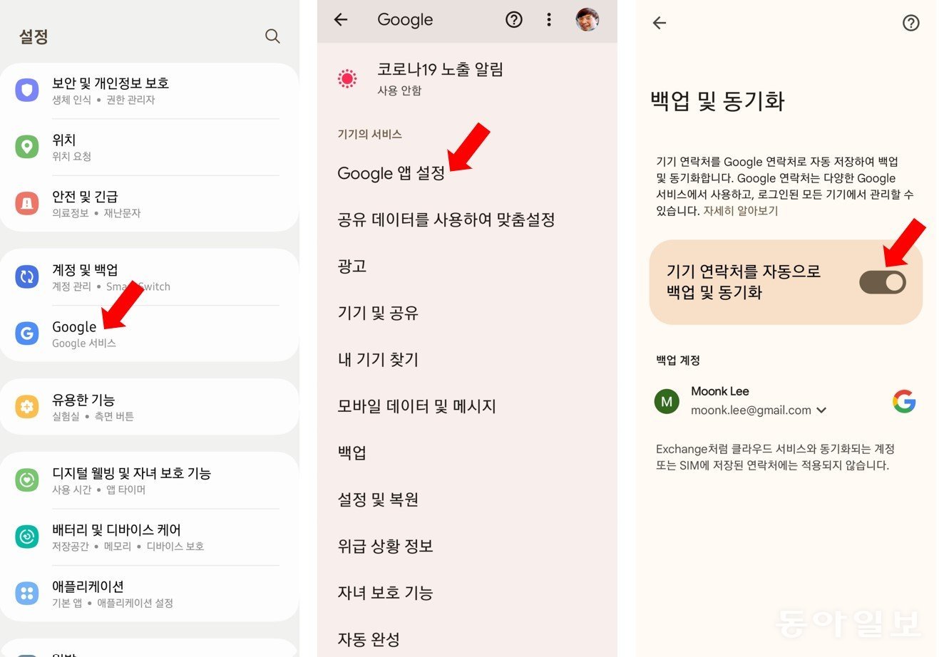 구글 주소록은 또한, 스마트폰 자체에 저장된 연락처도 저장/동기화하는 기능도 제공합니다. ‘설정’ -> ‘Google’ -> ‘Google 앱 설정’ -> ‘Google 주소록 동기화’ -> ‘기기 연락처 동기화’를 차례로 들어가서, ‘기기 연락처를 자동으로 백업 및 동기화’를 켜면 됩니다. 단, 기기 연락처 동기화에는 다른 구글 계정 하나가 필요하니, 추가 계정을 만들어 스마트폰에 등록하면 됩니다.