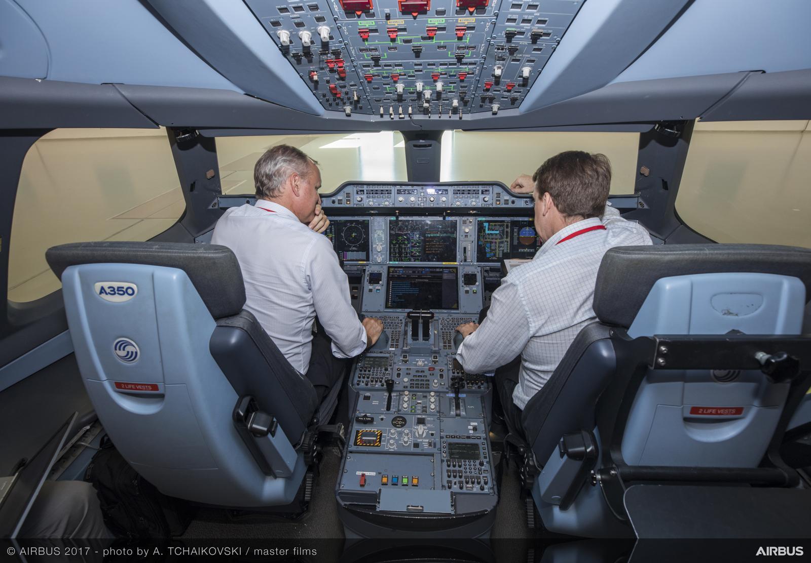에어버스 A350 기종의 훈련 시뮬레이터를 점검하는 에어버스 관계자들. 이처럼 여객기 등 대형기는 2인 이상이 함께 조종하도록 되어 있습니다. 출처 에어버스