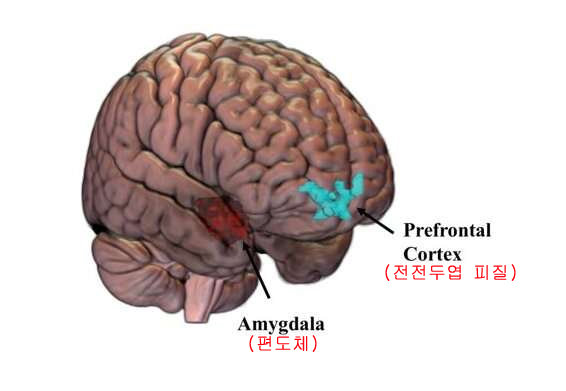 두뇌에서 감정·공포를 조절하는 뇌 영역인 편도체와 전전두엽 피질의 위치.