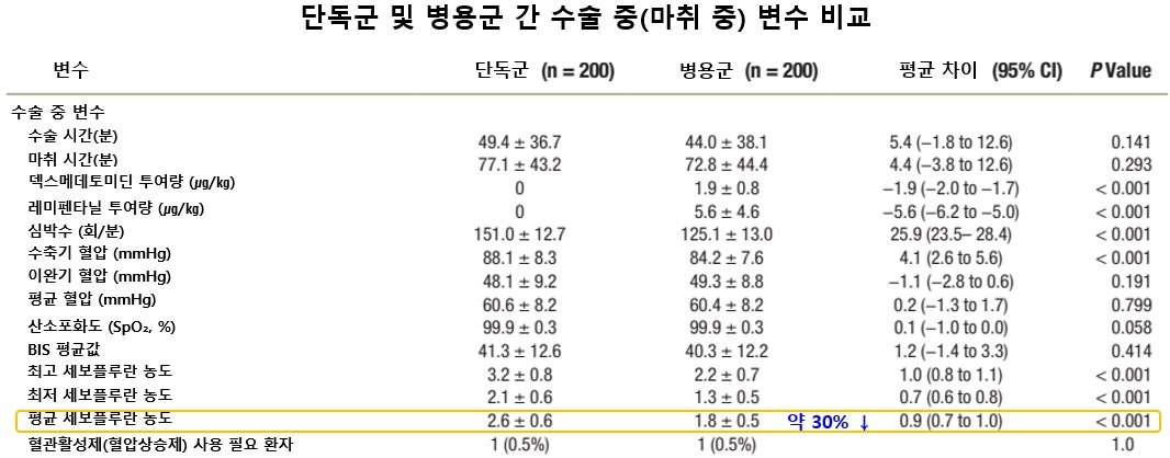 이번 임상은 약 2시간 이내의 짧은 수술만을 대상으로 했으며, 참여 환자는 무작위로 두 그룹에 배정됐다. 한 그룹은 흡입마취제(세보플루란)만 사용한 ‘단독군’, 다른 그룹은 같은 세보플루란에 보조 약제(덱스메데토미딘, 레미펜타닐)를 함께 투여한 ‘병용군’이었다.
