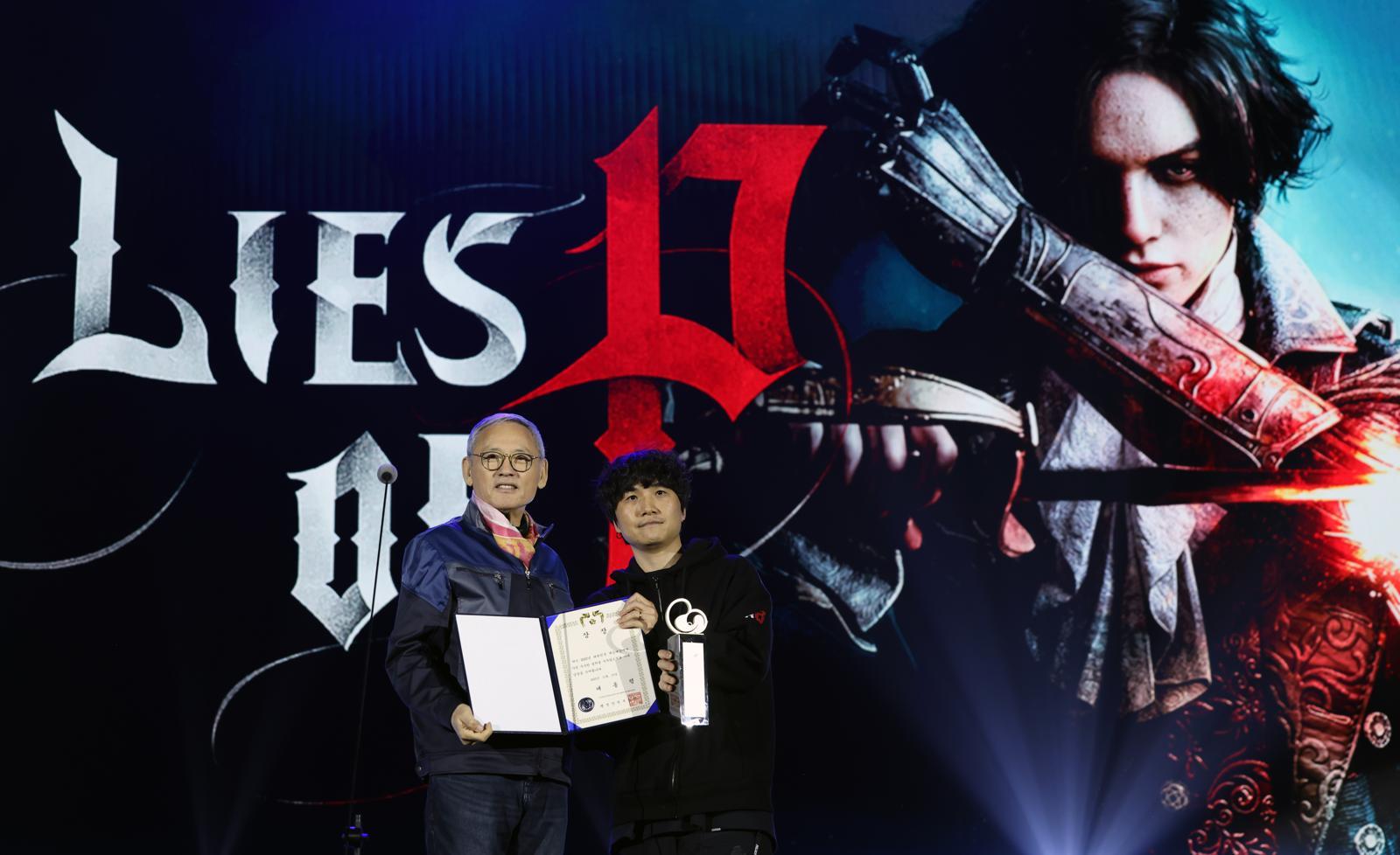유인촌 문화체육관광부 장관이 15일 부산 해운대구 벡스코에서 열린 2023 대한민국 게임대상 시상식에 참석해 ‘P의 거짓’ 네오위즈 ROUND8 스튜디오 최지원 총괄디렉터에게 대상을 수여한 뒤 기념촬영을 하고 있다. (문체부 제공) 2023.11.15/뉴스1