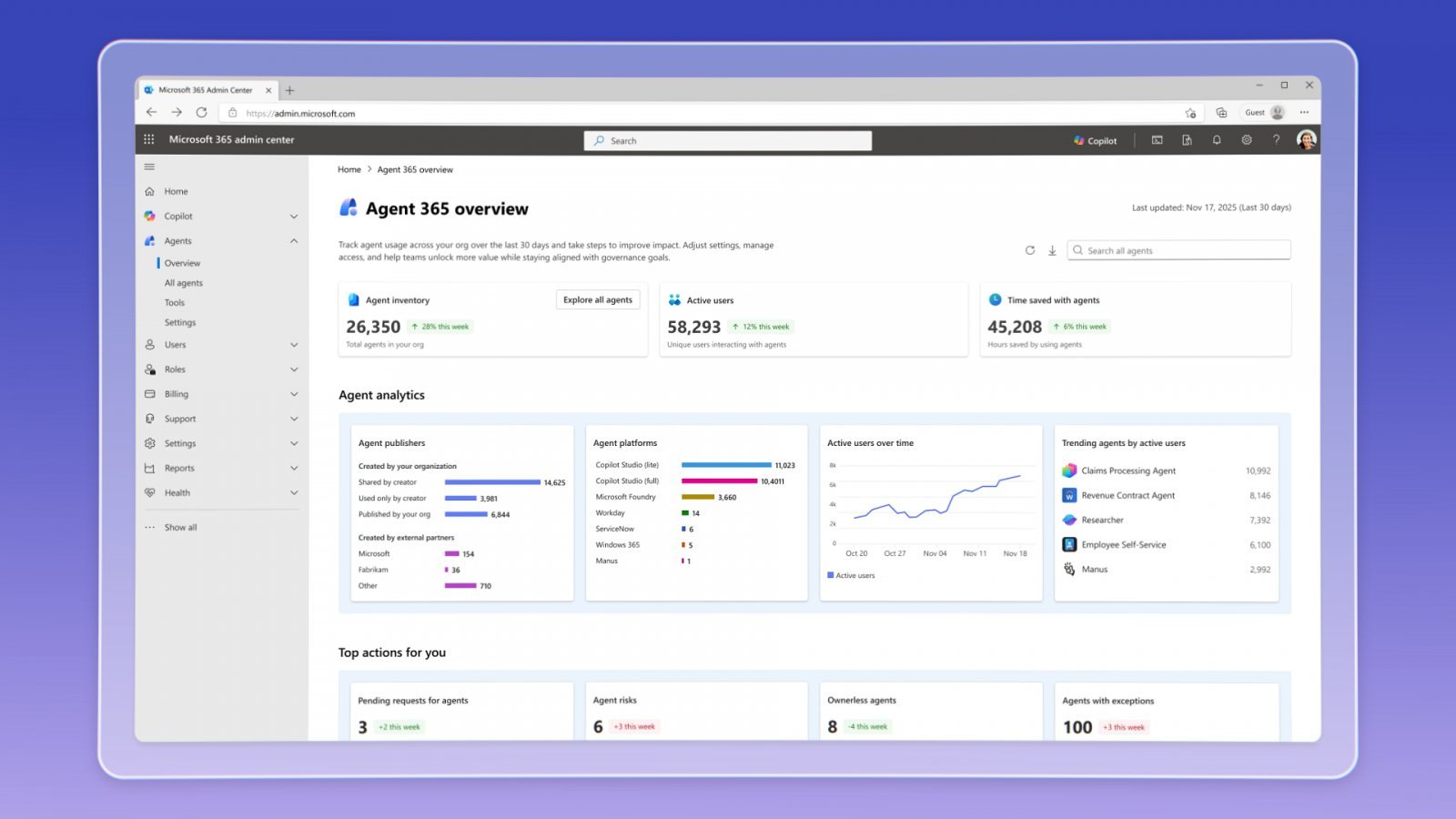 마이크로소프트 365 관리 센터(Microsoft 365 admin center to manage agents)(마이크로소프트 제공)