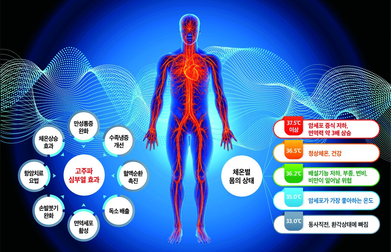 고주파 온열치료는 인체에 안전한 고주파 에너지를 이용해 피부를 통과하고 근육층과 장기 주변의 체내 깊숙한 부위까지 42∼45도의 열을 전달한다. 이때 발생한 심부열은 혈관을 확장시키고 혈류 속도를 높여 몸속 깊은 곳까지 혈액순환을 촉진하며 면역력을 높이고 신체 기능도 활성화한다. 이런 고주파 에너지를 활용한 온열치료는 실제 병원에서도 시행하고 있다. 당뇨 합병증으로 발가락 감각이 없던 환자가 고주파 치료 후 혈류량이 증가해 말초신경이 회복됐다. 뇌졸중 수술 후 안면마비가 발생한 환자도 고주파 치료 후 손상 부위의 신경이 회복돼 입과 눈 주변의 움직임이 정상으로 돌아오는 효과를 보였다.
