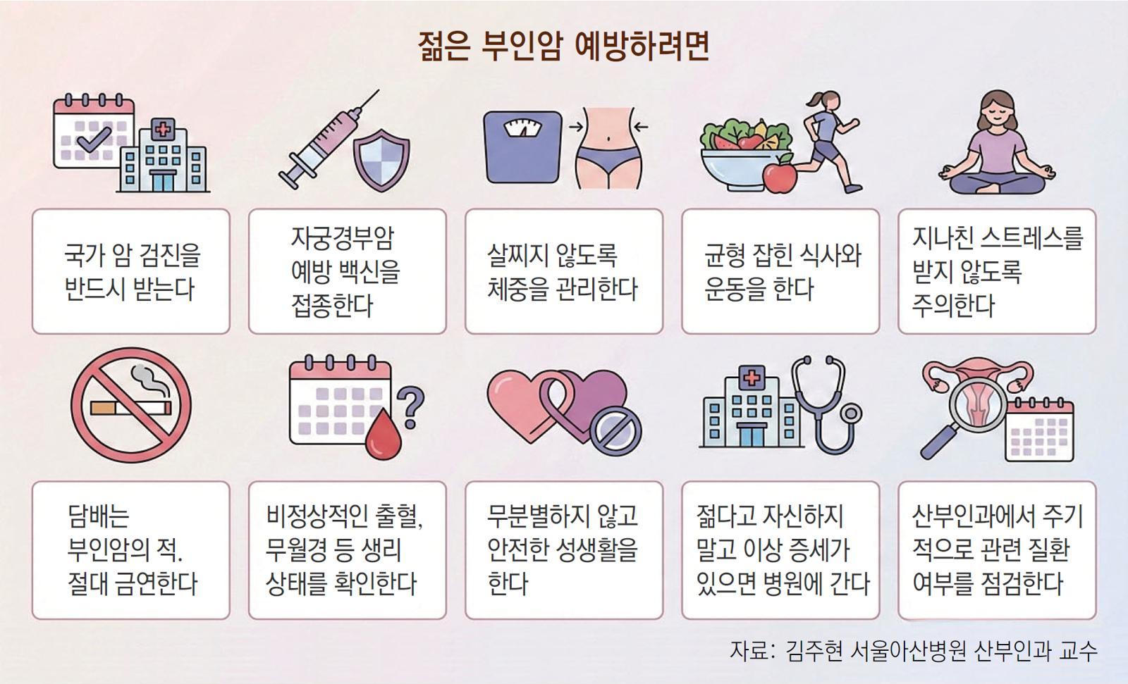최근 ‘젊은 부인암’ 환자가 늘고 있다. 국가암등록통계(2022년)에 따르면 국내 여성의 암 발생 상위 3가지는 유방암 갑상샘암 대장암 순이다. 자궁경부암은 8위, 난소암은 9위다. 하지만 15∼34세로 국한하면 자궁경부암이 4위, 난소암이 5위로 껑충 뛸 만큼 젊은 부인암 환자가 많다. 김 교수는 “비만과 서구화된 식습관이 젊은 부인암 증가의 공통된 원인”이라고 설명했다. 다만 부인암에 따라 환자 증가의 구체적 이유는 약간씩 다르다.