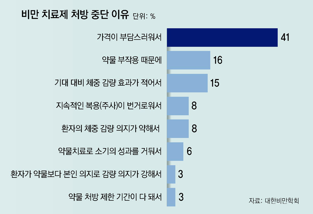 대한비만학회는 조사 결과 약물 남용보다 비만을 질병으로 인식하지 못하는 사회적 분위기와 적절한 비만 치료를 제공하기 어려운 구조적 한계가 존재했다고 말했다. 의료진의 83%는 비만 치료의 중요성을 인정했고, 87%는 비만치료제가 환자에게 도움이 될 것이라고 응답했다. 그러나 실제로 적극적으로 비만 진료를 시행한다고 답한 비율은 63%에 불과했다. 그 이유로 의사들은 “비만 진료는 시간이 오래 걸리지만 별도의 상담 수가가 없다” “비만치료제가 고가라 환자의 경제적 부담이 크다”고 지적했다. 실제로 비만 치료가 필요한 환자에게 치료를 권하지 않는 가장 큰 요인은 ‘비용 부담’과 ‘진료 시간 부족’이었다.