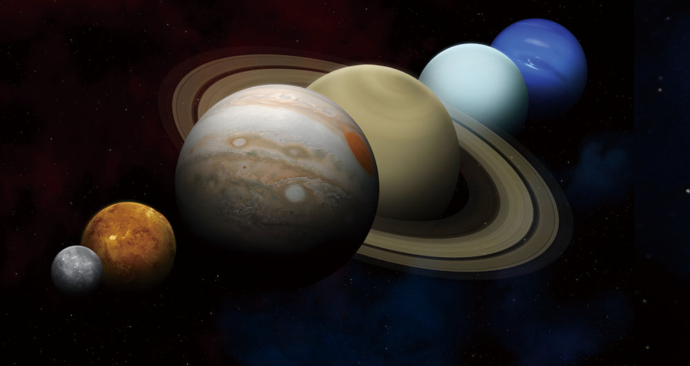 내년 2월 말 수성, 금성, 목성, 토성, 천왕성, 해왕성이 지구의 공전궤도면인 황도를 따라 줄지어 보이는 ‘행성 퍼레이드’를 볼 수 있을 것으로 예측된다. 사진은 6개 행성의 모습을 나타낸 가상의 이미지. 왼쪽부터 수성(Mercury), 금성(Venus), 목성(Jupiter), 토성(Saturn), 천왕성(Uranus), 해왕성(Neptune). 게티이미지뱅크