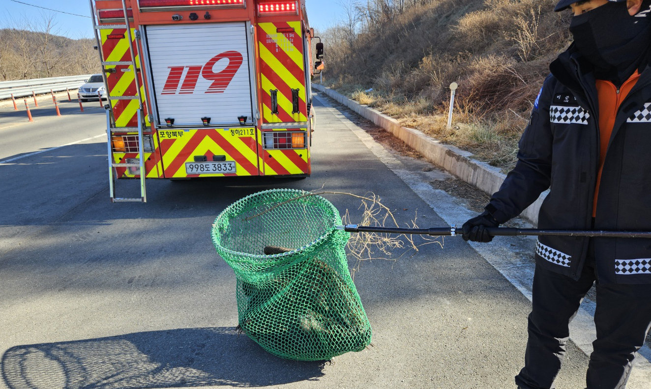 지난 6일 경북 포항시 북구 신광면 호리못 인근 도로에서 날개를 다친 독수리 1마리가 119에 구조됐다. 2026.1.7. 포항북부소방서 제공