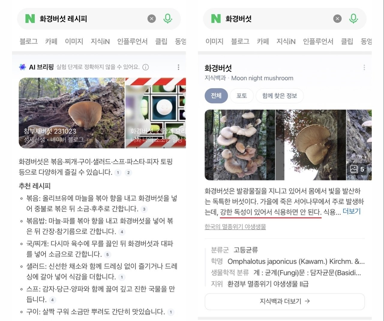 8일 정보기술(IT) 업계에 따르면 한때 네이버에 ‘화경버섯 레시피’를 검색했을 때 AI 브리핑에는 별도 주의문구 없이 다양한 레시피가 추천됐다.