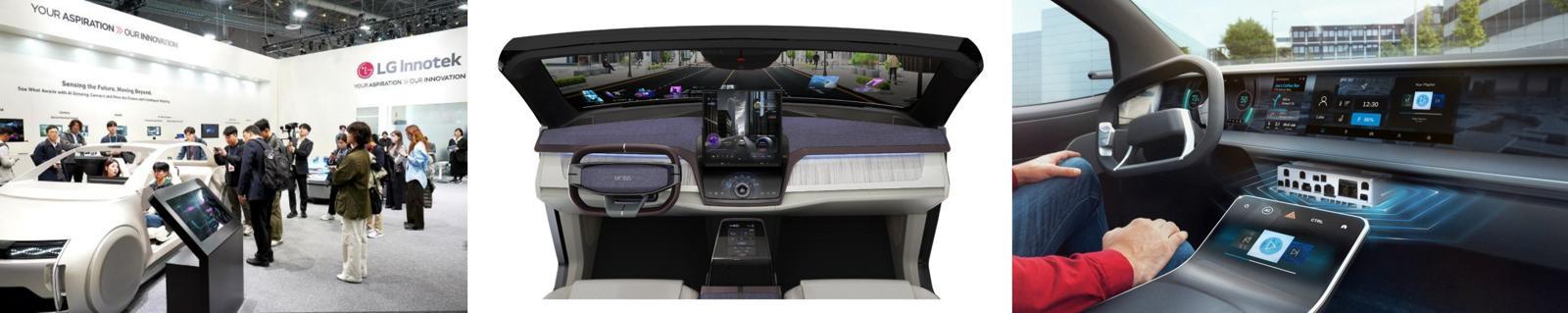 CES 2026에 참가한 LG이노텍 부스와 현대모비스 윈드실드 디스플레이, 보쉬 AI 기반 콕핏 (왼쪽부터) / 출처=각사