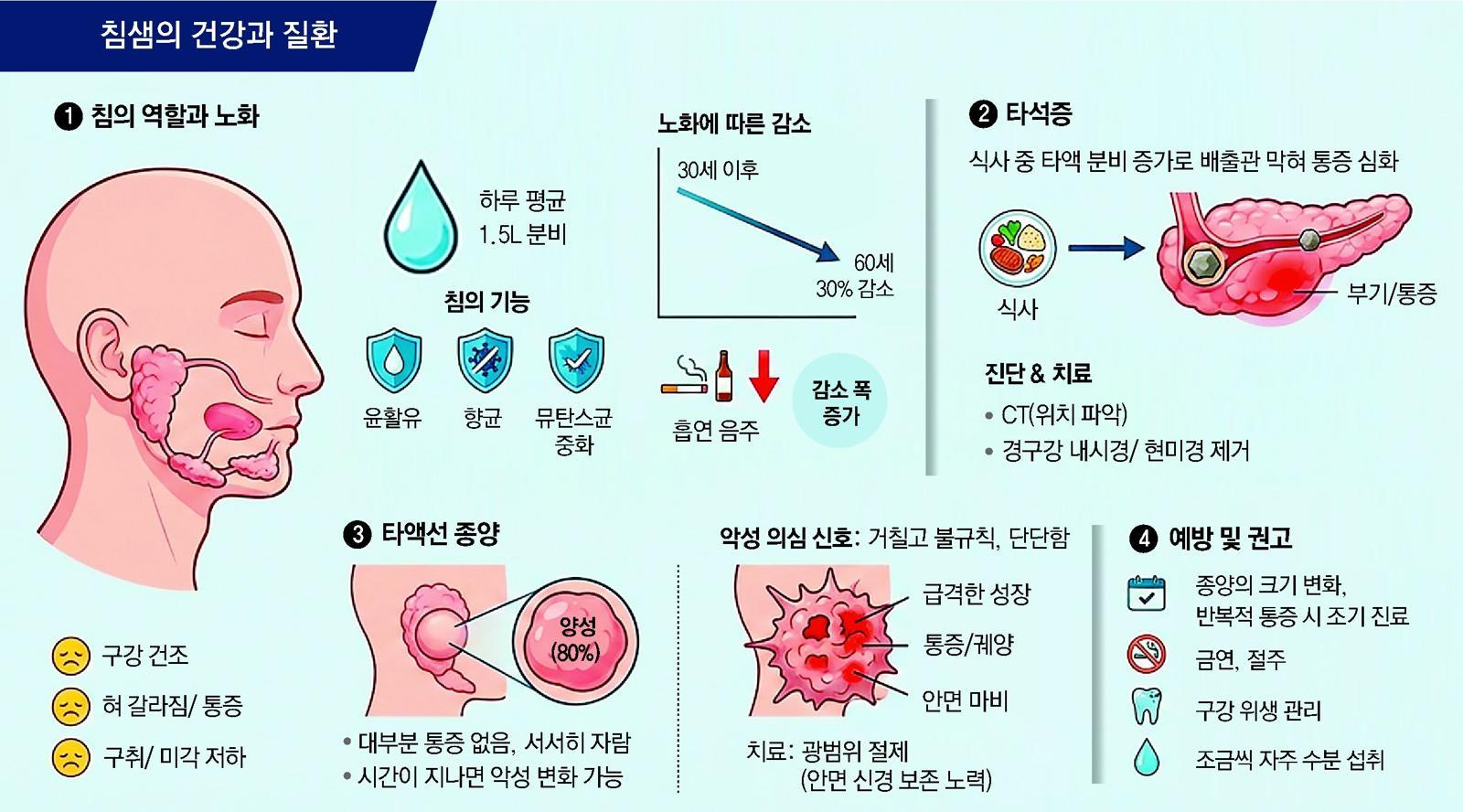침은 하루 평균 1.5ℓ가 분비된다. 음식물을 씹고 삼키는 과정을 돕는 윤활유 역할을 할 뿐 아니라 침 속에 들어 있는 라이소자임과 락토페린, 면역글로불린 (IgA)은 구강 내 세균 증식을 억제해 감염을 막는다. 충치의 원인균으로 알려진 뮤탄스균을 중화하는 기능도 침이 맡는다. 하지만 침 분비량은 나이가 들수록 줄어든다. 30세 이후 매년 약 1%씩 감소해 60세가 되면 30%가량 줄어든다. 흡연이나 음주가 잦을 경우 감소 폭은 더 커진다. 침이 줄면 구강은 쉽게 건조해지고 혀 표면이 갈라지며 통증이나 작열감을 느끼기도 한다. 인후 이물감과 구취가 동반되고 음식 맛을 잘 느끼지 못하는 경우도 적지 않다. 고령층에서 침샘(타액선) 질환이 증가하는 배경이다.