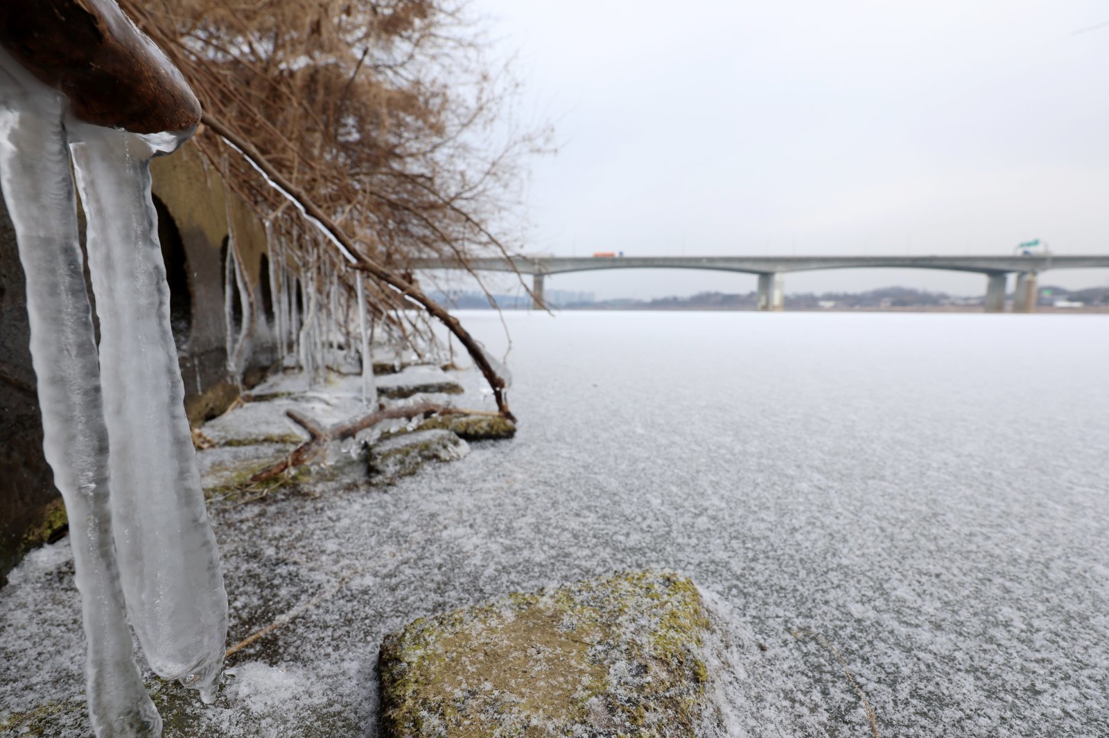 한파가 이어진 12일 경기 하남시 미사대교 인근 얼어붙은 한강 위로 눈이 쌓여 있다. 2026.01.12. [서울=뉴시스]
