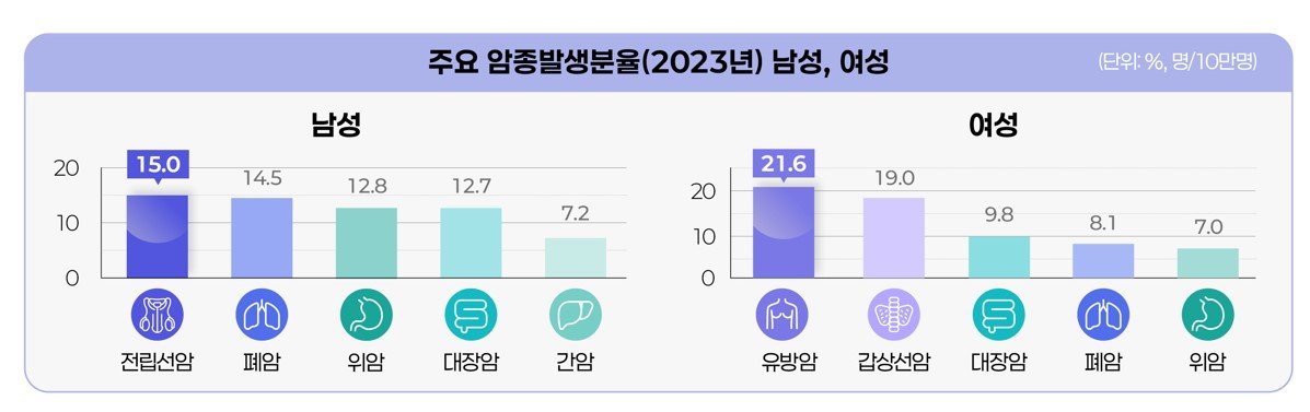 특히 남성의 경우 처음으로 전립선암이 폐암을 제치고 1위를 차지했다. 그다음 폐암(22년 1위) - 위암 - 대장암 - 간암 - 감상선암 순으로 이어졌다.