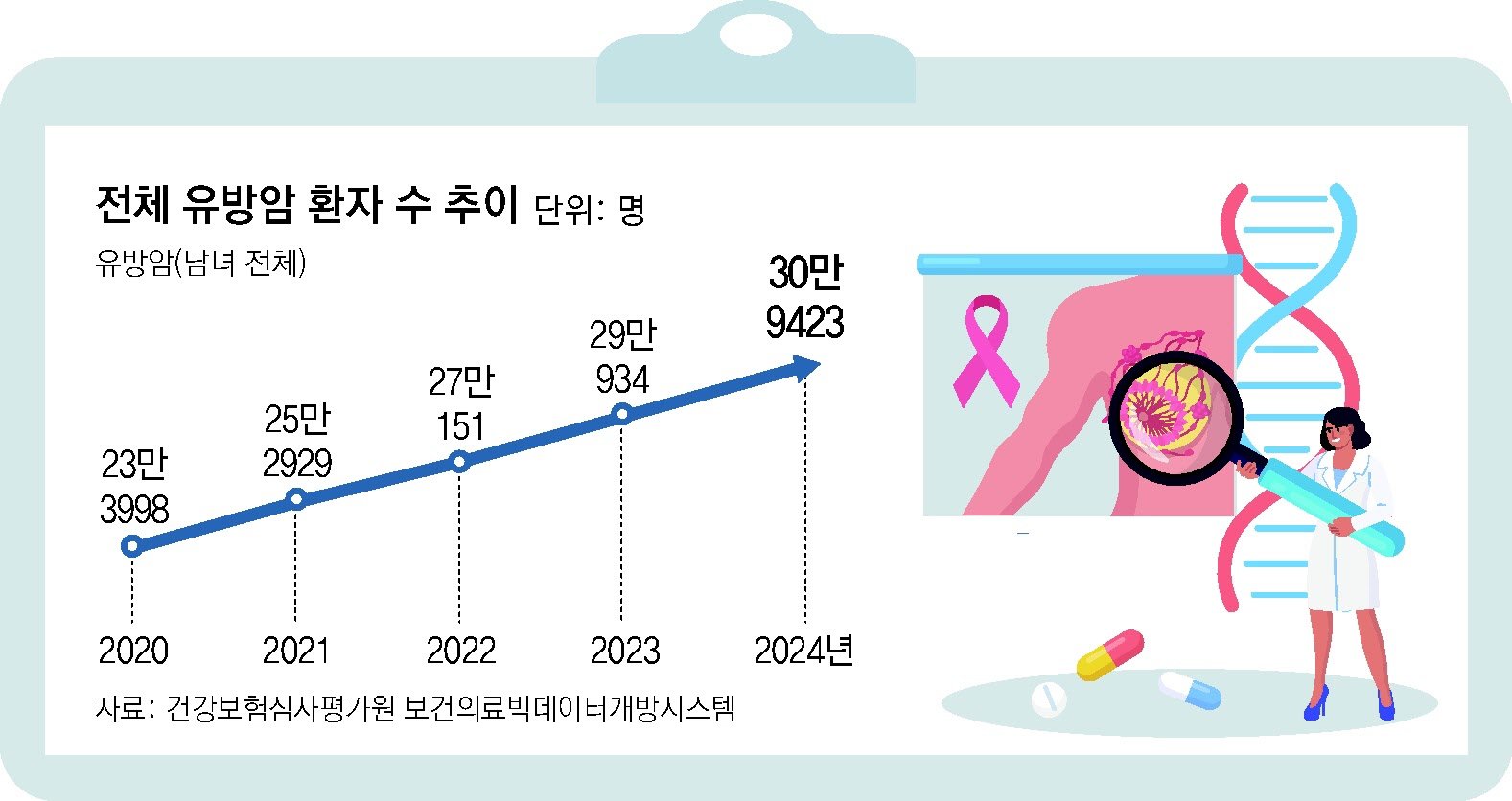 최근 발표된 ‘2023년 국가암등록통계’에 따르면 유방암은 한 해 2만9715명의 환자가 발생하는, 여성에게 가장 유병률이 높은 암이다. 유방암은 가정의 중심이고 사회 활동이 활발한 40, 50대 여성에게 가장 많이 나타나 환자 개인을 넘어 사회적으로도 큰 손실을 미치고 있다.