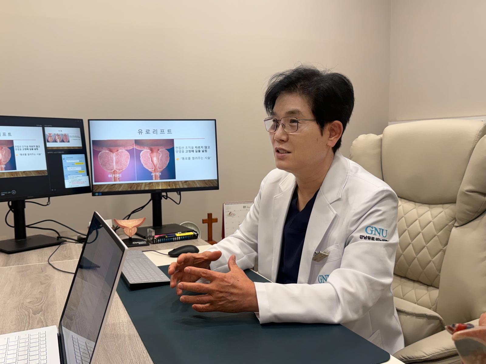 ‘전립선 명의’ 이무연 강남유로비뇨의학과의원 대표원장이 유로리프트 시술에 대해 설명하고 있다. 이 원장은 “유로리프트는 고령이거나 기저질환으로 침습적인 치료를 피하고 싶은 환자에게 적합하다”고 말했다.