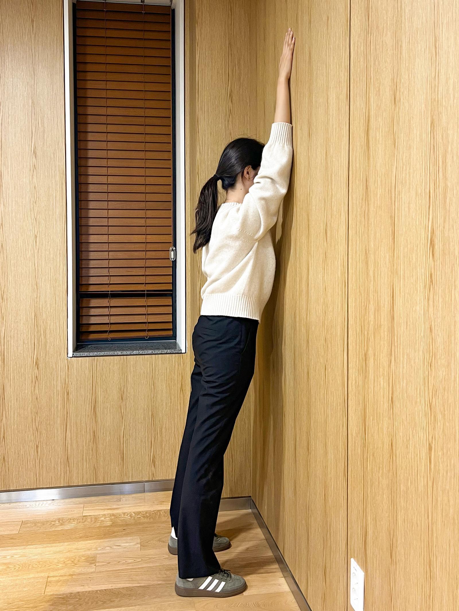 ➊ 벽과 약 30cm 간격을 두고 선다. 벽에 상체를 밀착하고 한쪽 팔을 위로 천천히 뻗는다. 팔을 늘린다는 느낌이어야 한다. 최대한 팔을 들어 올린 후 5∼10초 멈춘다. 15∼20회 반복한 뒤 같은 요령으로 반대쪽도 운동한다.