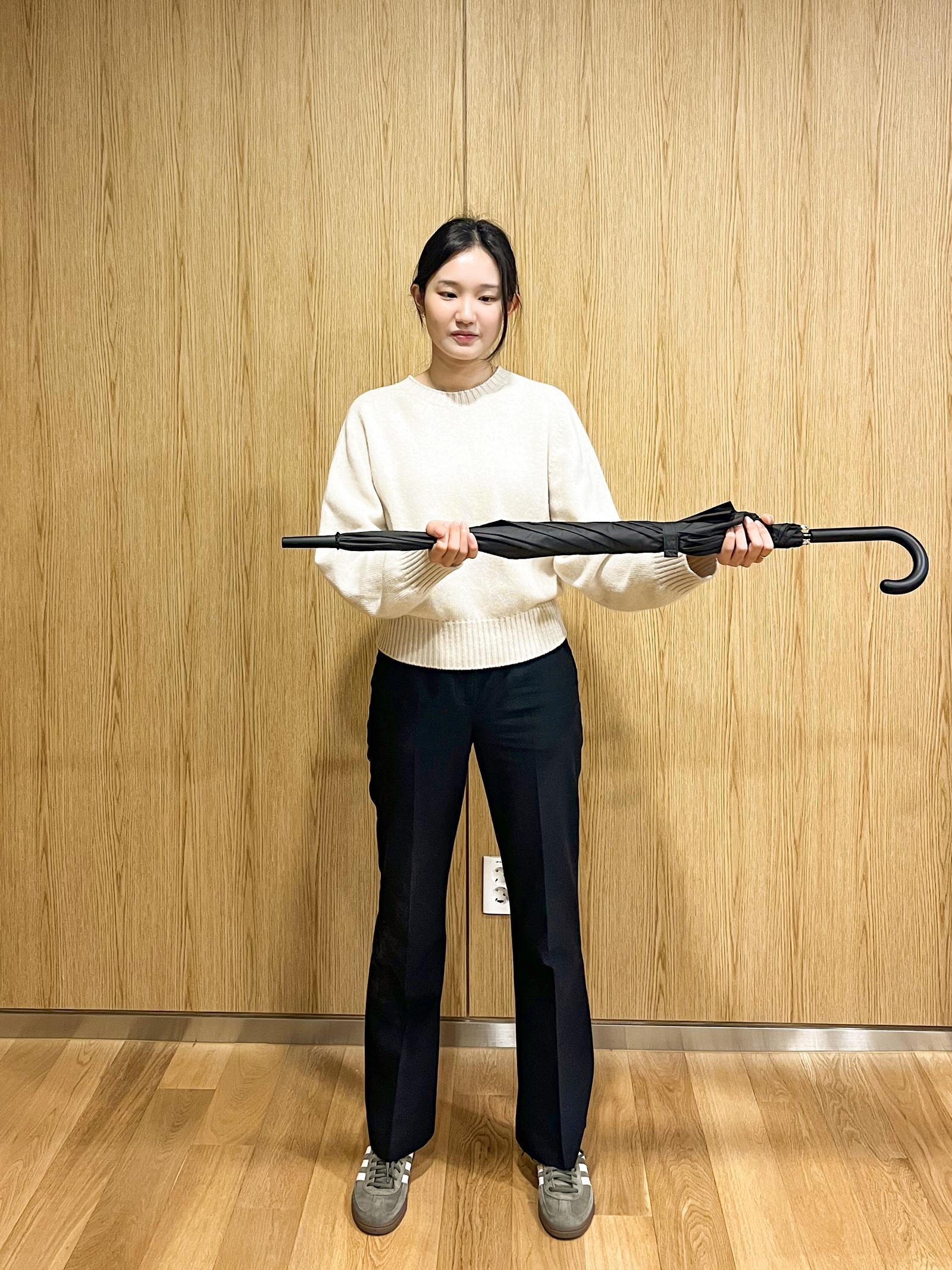 ➌ 두 손으로 우산을 잡고 양팔을 옆구리에 붙인다. 이때 손등이 바닥을 향하게 해야 한다. 손등을 천장으로 향하게 하면 어깨에 무리가 갈 수 있다. 이어 팔을 오른쪽으로 천천히 돌린다. 팔은 옆구리와 항상 붙어 있어야 한다. 최대한 팔을 돌린 후 5∼10초 정지. 15∼20회 반복 후 좌우 교대.
