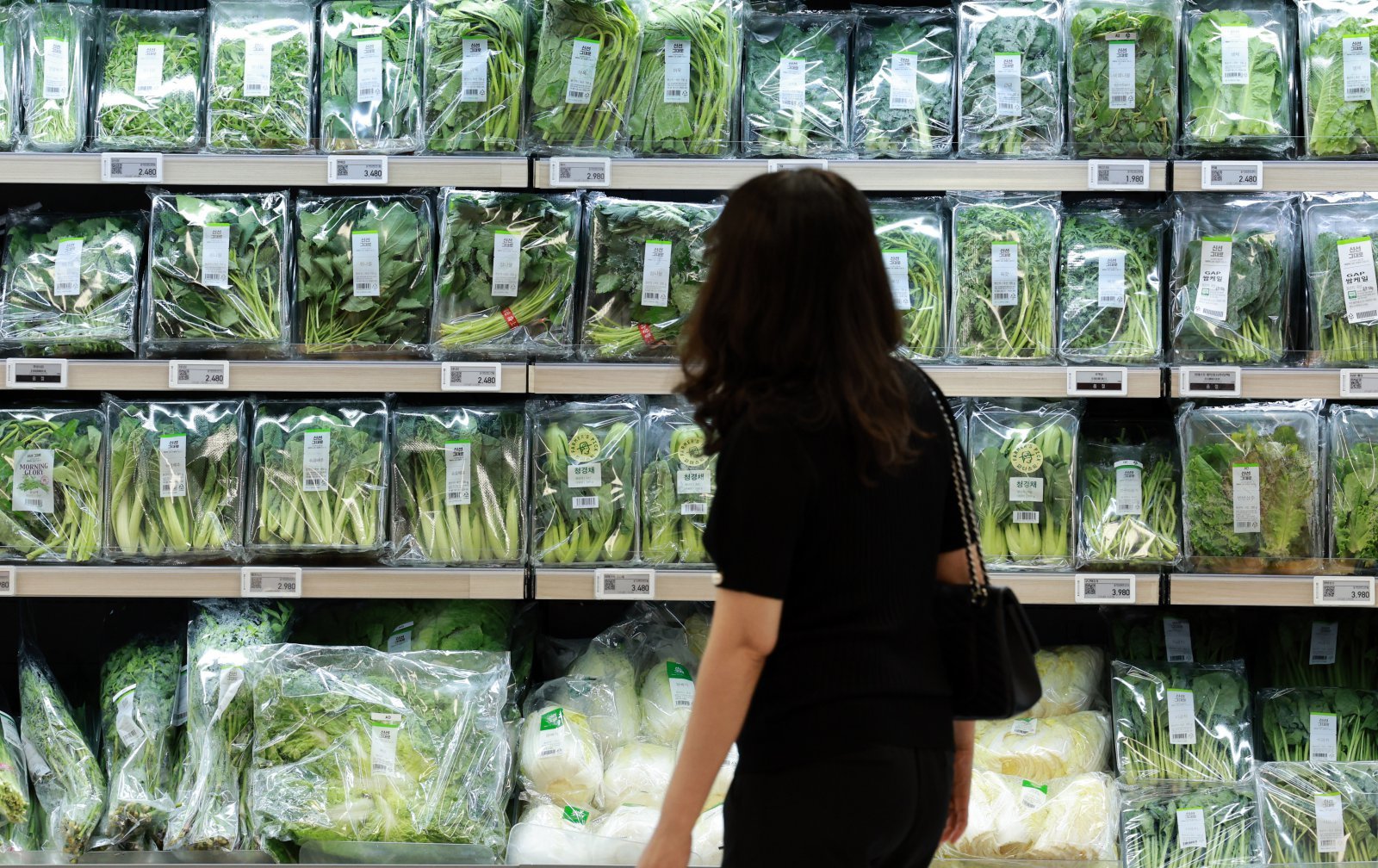 장마가 시작된 뒤 일부 농가의 침수 피해로 상추와 수박 등 채소와 과채류 가격이 올랐다. 적상추 100g 가격이 1주일 만에 56.3% 뛰어 한 달 전보다 2배 넘게 올랐다. 깻잎과 시금치, 풋고추 등도 모두 1주일 만에 10% 이상 올랐고, 수박과 참외, 토마토 등 여름철 대표 과채류도 줄줄이 가격이 오르기 시작했다. 22일 서울의 한 대형마트에서 소비자들이 상추 등 잎채소류를 살펴보고 있다. 2024.07.22. [서울=뉴시스]
