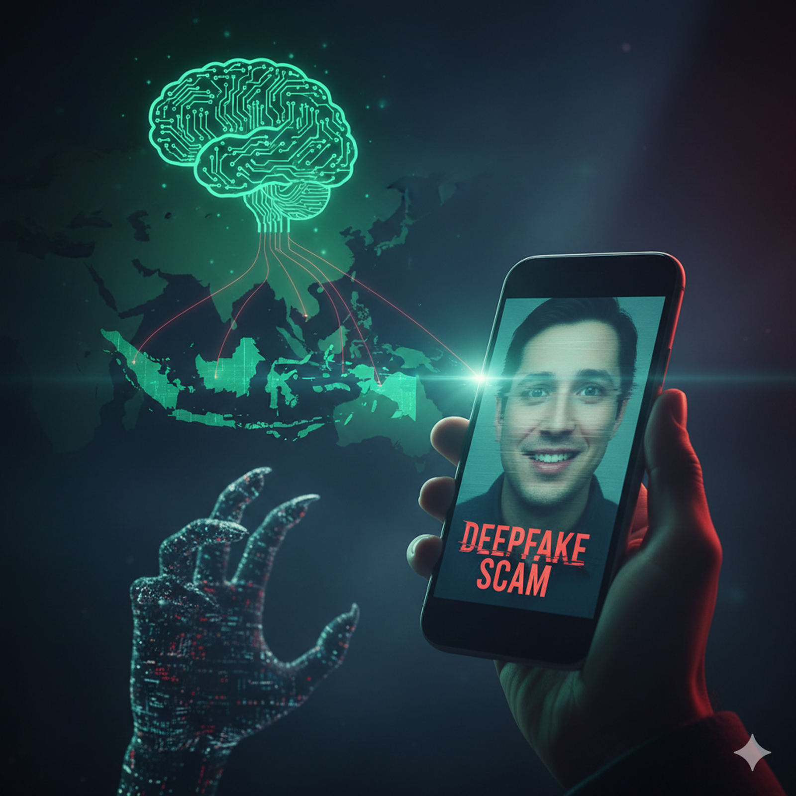 딥페이크 사기를 의미하는 스마트폰 화면 속 가짜 인물 얼굴과 ‘DEEPFAKE SCAM’ 문구, 동남아시아 지도 위에 연결된 AI 네트워크 그래픽이 표현된 이미지. 제미나이 AI 생성 이미지