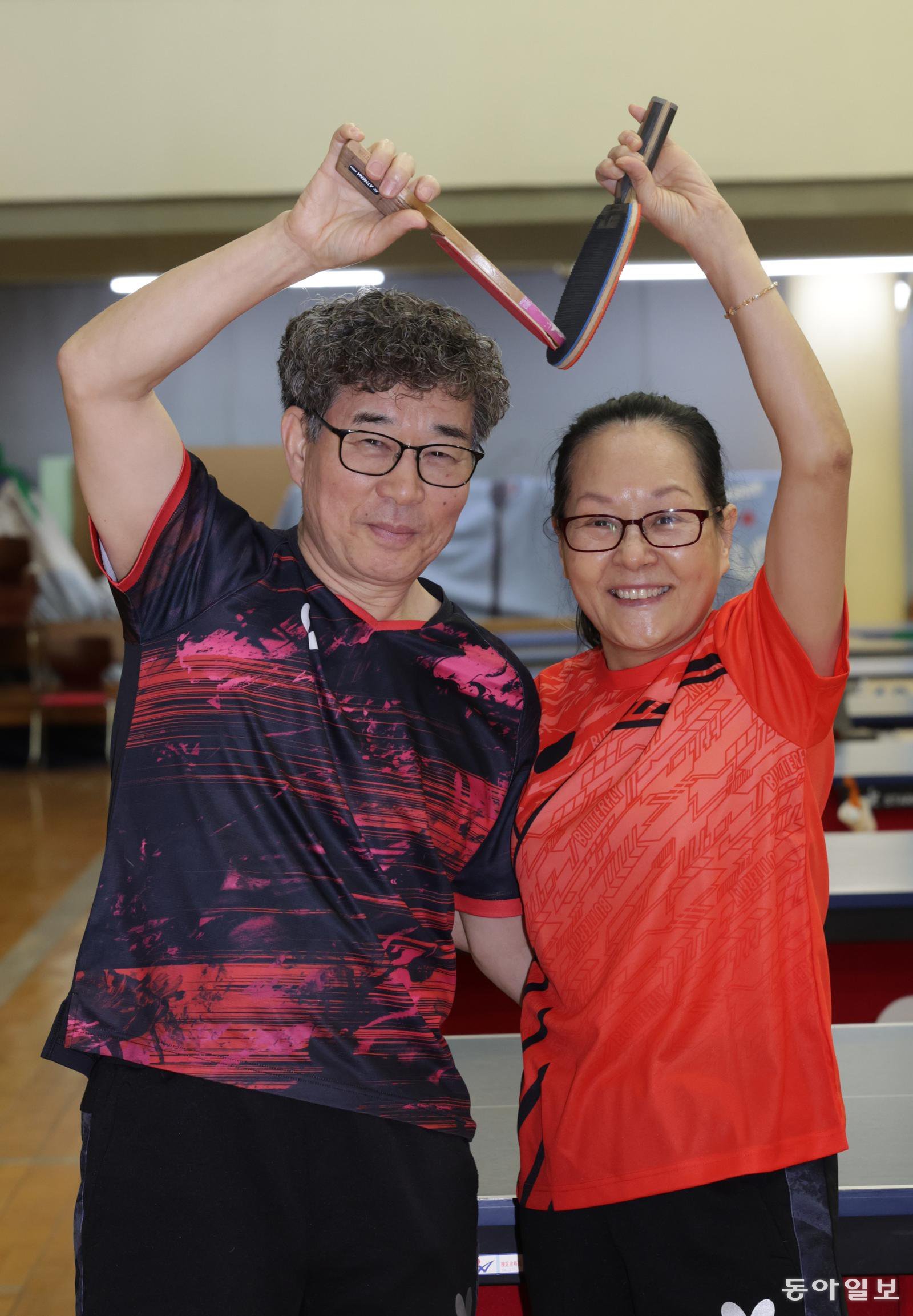 이동명(왼쪽) 김석순 씨 부부가 서울 강동구 코리아탁구체육관에서 밝은 표정으로 라켓을 들고 몸 하트를 만들었다. 30년 전 함께 탁구를 쳤던 부부는 서로 일 때문에 바빠 20여년 탁구 치기를 사실상 중단했다가 2024년 남편이 은퇴한 뒤부터 다시 라켓을 잡고 부부의 정을 쌓고 있다. 변영욱 기자 cut@donga.com