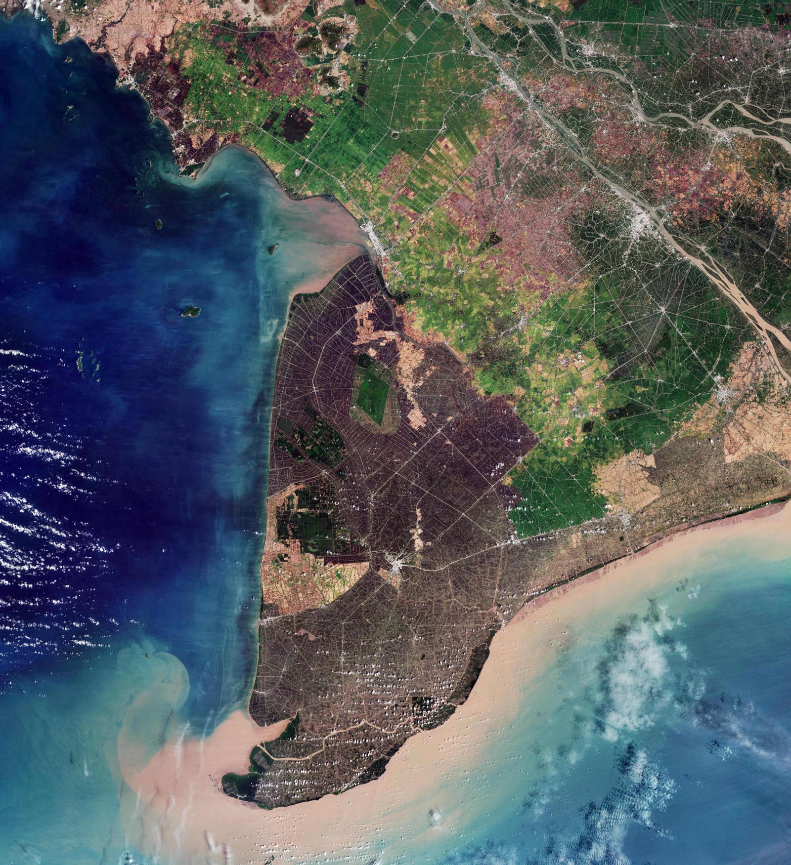 유럽우주국(ESA) 위성 ‘센티넬-2’가 지난해 2월 촬영한 베트남 메콩강 삼각주. 연구팀은 메콩강 삼각주 현장 조사를 계기로 해수면 기준 산정의 문제를 처음 인식했다. ESA 제공
