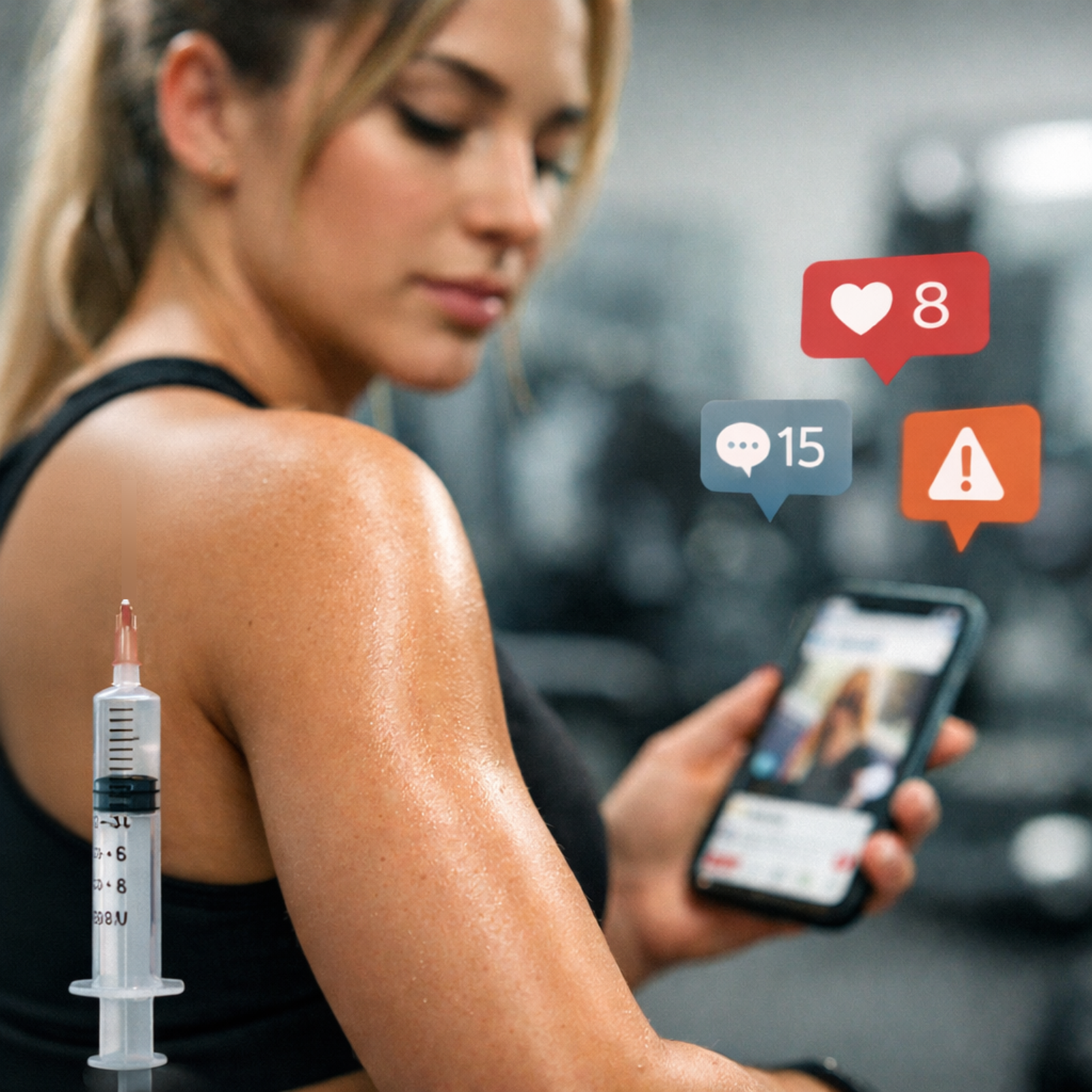 운동 중 스마트폰을 확인하는 장면 뒤로 주사기가 배치된 이미지. 소셜미디어에서 확산되는 ‘주사형 펩타이드’ 트렌드와 건강 관리의 경계가 흐려진 현실을 생성형 AI를 통해 시각적으로 표현했다. 챗GPT 생성 이미지