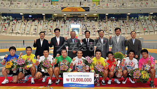 19일 제2회 스포츠동아배 대상경륜 대회가 끝난 후 입상 선수들과 관계자들이 기념촬영을 했다. 최상헌 경주사업본부 고객만족실장, 최상림 공정실장, 방오성 경륜고객대표, 송대근 스포츠동아 대표, 최정호 경륜운영단장, 이성춘 스포츠동아 편집국장, 김재범 스포츠동아 엔터테인먼트부장과 노택훤, 한상진, 김재환(우수 결승), 이용희, 이욱동, 김현경(특선 결승), 권영하, 강성민, 신영극(선발 결승) 등 스포츠동아배 대상 경륜 우승자.(윗줄 왼쪽부터 시계방향으로) 광명 | 국경원 기자 onecut@donga.com