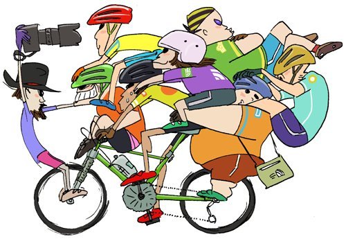 2년여간 약 4000km의 대한민국 둘레길을 자전거로 달리게 될 집단가출 자전거 식객은 허영만 화백을 포함해 모두 8명으로 시작됐다. 눈이오나 비가오나, 궂으나 맑으나, 추우나 더우나 자전거 둘레길을 찾아가는 페달질은 멈추지 않는다. 허화백의 이 그림에서 집단가출 멤버들은 한 대의 자전거에 함께 타고 달리고 있다. 무릇 모든 여행이 그렇지만 집단으로 가출해 자전거를 타고 전국을 순례하는 것도 팀워크가 생명이다.