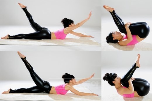 1. 엎드려서 양팔을 머리 위로 쭉 뻗고 기지개 켜듯 전신을 이완시킨다. 숨을 들이마시며 오른팔과 왼 다리를 높게 들어올린다. 5초 정지, 3회반복.