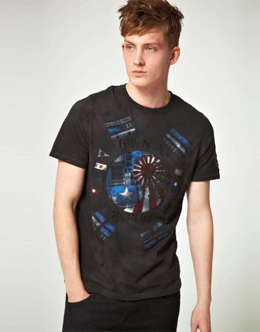 공개된 사진에는 태극기를 연상시키는 티셔츠를 입고 있는 한 남자모델의 모습이 담겨 있다. 문제가 된 것은 남성이 입고 있는 티셔츠다. 태극 문양에 성조기와 욱일승천기가 새겨진 것.