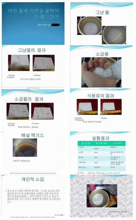 공개된 남동생이 만든 PPT 사진 속에는 라면의 쫄깃함을 실험하기 위해 소금, 설탕, 식용유 등을 넣어 실험한 결과가 담겨 있다.