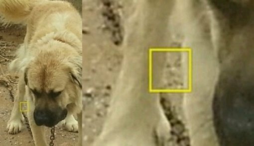 이 사진은 얼굴을 인식하는 스마트폰 애플리케이션으로 강아지를 찍었지만, 강아지의 얼굴이 아닌 땅을 인식하고 있다. 노란색 네모 속에 찍힌 땅에는 사람의 눈, 코, 입과 비슷한 형태를 띄고 있다.