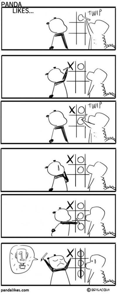 하지만 공룡이 두 번째 O를 그리자, 판다는 그 아래에 O를 그린 후 자신이 이겼다고 억지를 부린다.