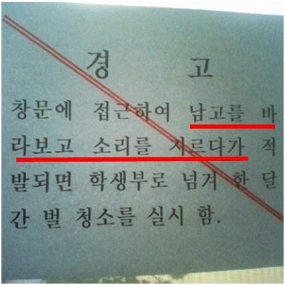 최근 온라인 게시판에 공개된 ‘여고의 흔한 교칙’ 사진에는 “창문에 접근하여 남고를 바라보고 소리를 지르다가 적발되면 학생부로 넘겨 한 달간 벌 청소를 실시 함”이라는 내용의 경고문이 담겨 있다.