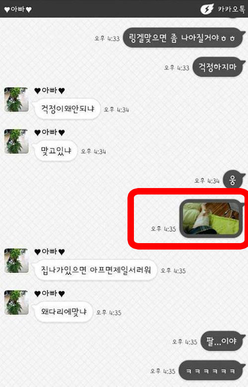 공개된 대화 내용에서 아빠는 아픈 딸에게 걱정스러운 마음을 전달 한다. 이에 딸은은 닝거를 맞고 있으니 괜찮아 질것이라며 인증 사진을 보낸다. 그러자 아빠는 “왜 (링거를) 다리에 맞냐”고 물었고 딸은 “팔이야”라고 답변한다.